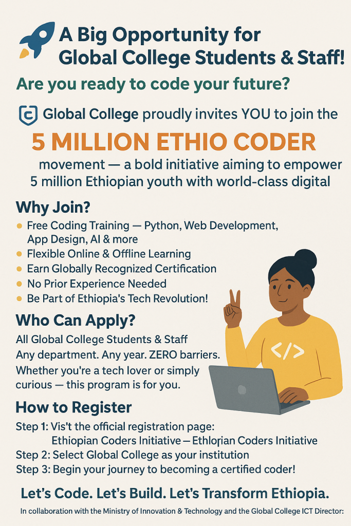 Global College proudly invites YOU to join the nationwide “5 Million Ethio Coder” movement a bold initiative aiming to empower 5 million Ethiopian youth with world-class digital skills!